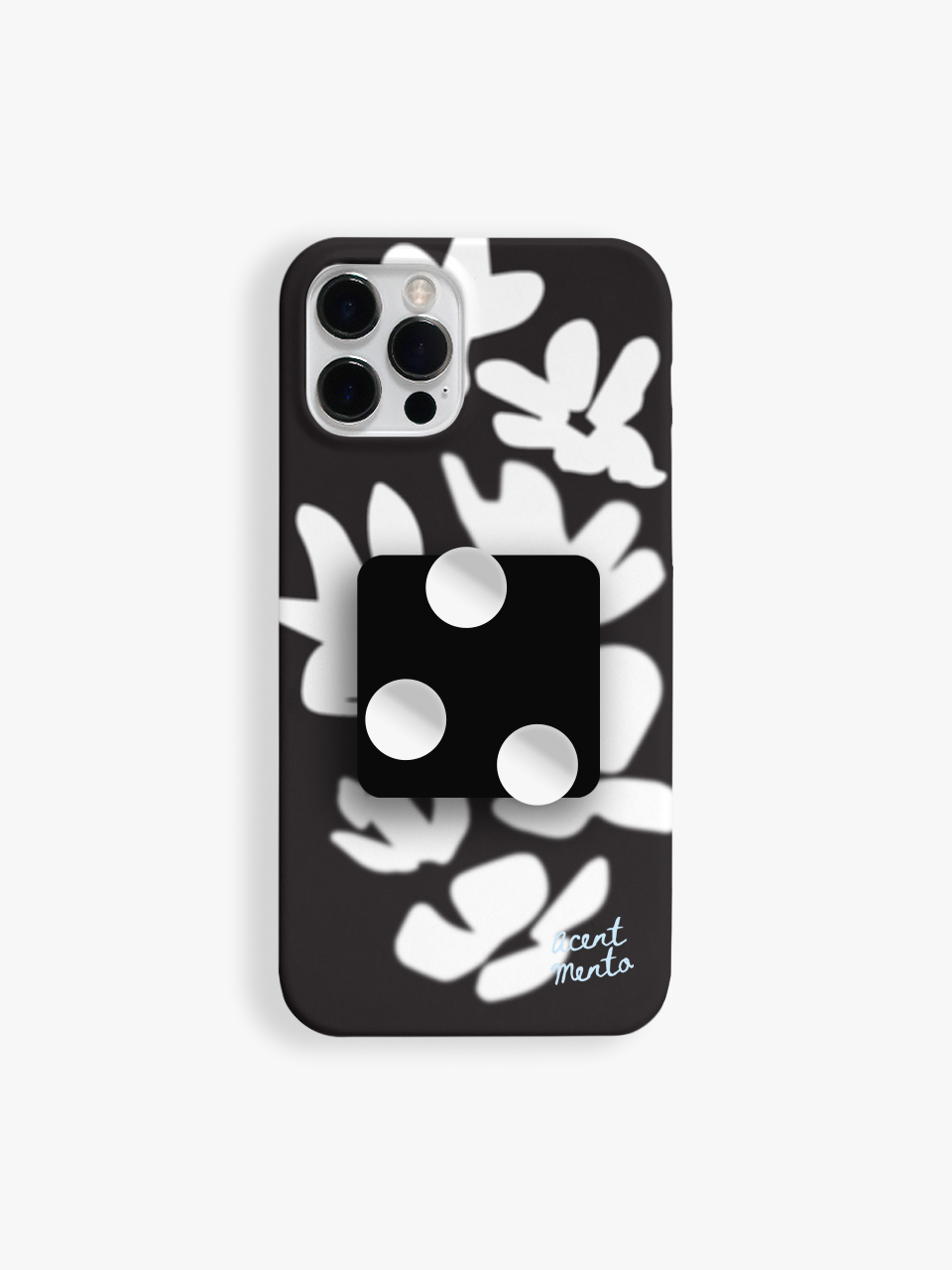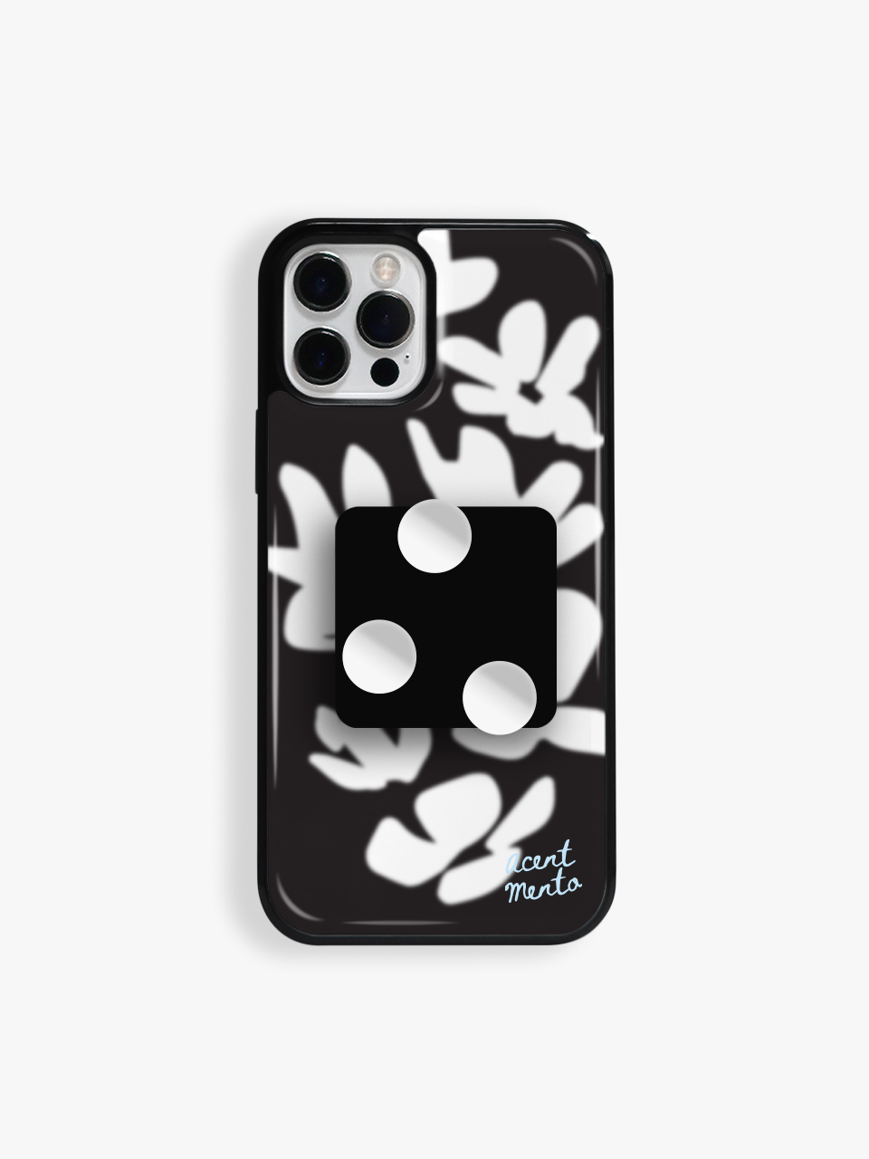 블러된 흰 꽃들과 대비를 이루는 사각형의 원형 미러 오브제톡의 조화로