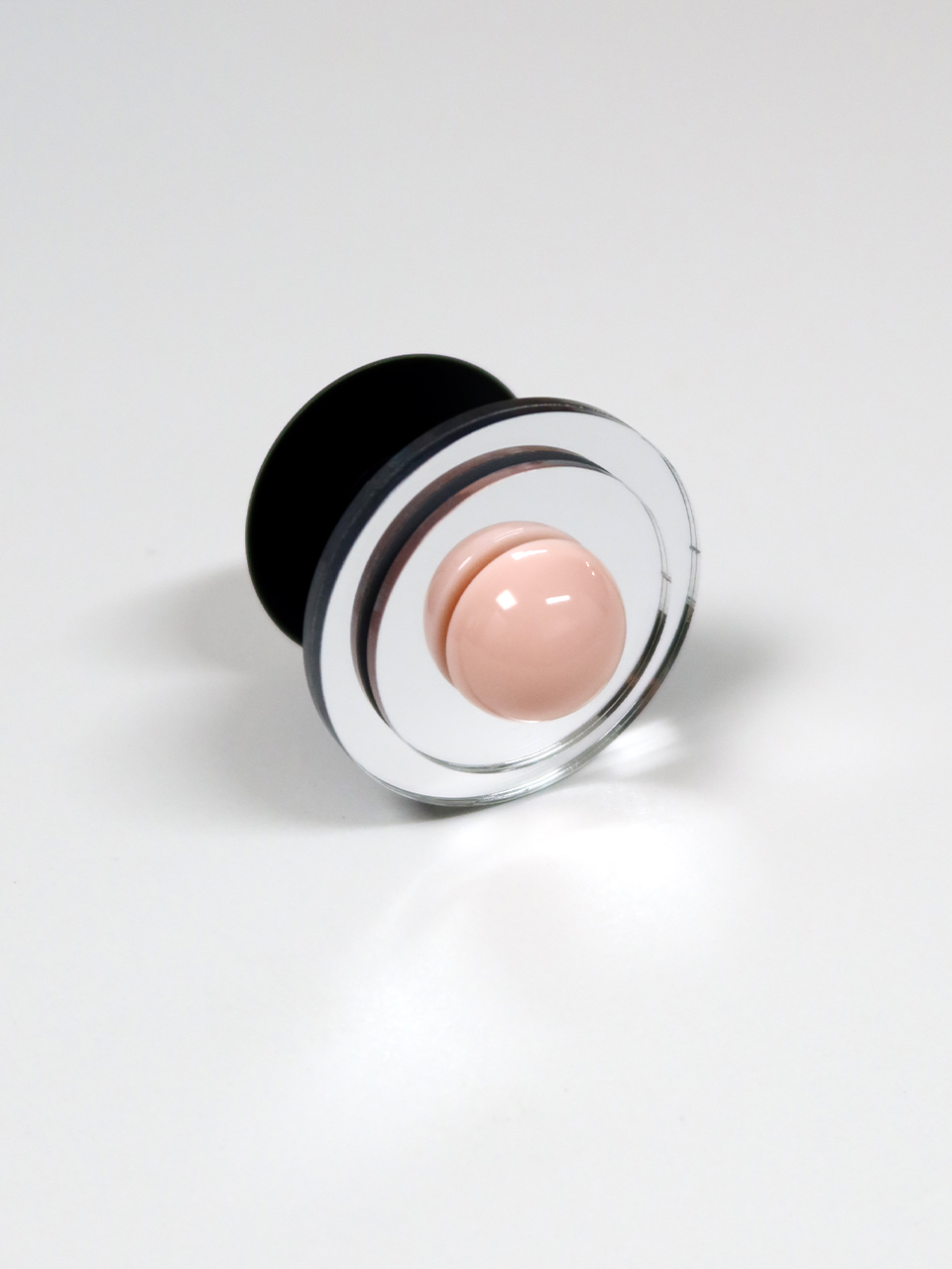 원형의 쌓여진 형태 위, 연분홍 색상의 원형 오브제의 조화의